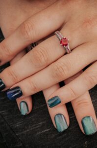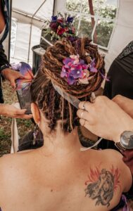 Nathalie maakte haar eigen bruidsjurk; een uniek en persoonlijk meesterwerk. Haar kleurrijke haar, mét dreads, en de bloemen die overal subtiel terugkwamen sloten prachtig aan bij de rest van de styling. Daniël droeg een opvallend blauw pak met kleurrijke schoenen en een paars strikje. Het kleurenpalet van paars, groen en blauw was fris, vrolijk en helemaal passend bij een nazomerfestival.