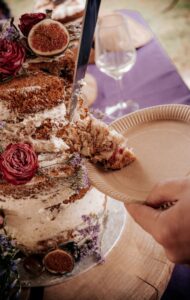 Het weekend had precies de vibe die je hoopt bij een festivalbruiloft. Ja, er was een stevige regenbui tijdens de borrel en ja, die blies vrolijk de extra stretchtent omver. Maar de daggasten verzamelden zich spontaan om samen op te bouwen en door te gaan alsof er niets was gebeurd. De sfeer bleef heerlijk vrolijk en ontspannen. Slapen bij Herman – jarenlang een Vierdaagsecamping – was de ideale plek voor zo’n driedaags samenzijn. Veel ruimte, natuur, kampeergevoel en de mogelijkheid om met de hele groep te blijven slapen: precies wat Nathalie & Daniël wilden.